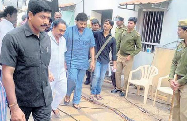 Mega Star Chiranjeevi is busy in his shoot for his 150th film. While earlier, the star is seen in colorful costumes, he is now spotted in prisoner's d...