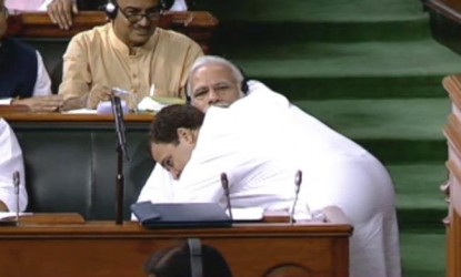 కాంగ్రెస్ అధ్యక్షుడు రాహుల్ గాంధీ ఇవాళ్ళ తన స్వంతపార్టీ సభ్యులతో పాటు ప్రధాని నరేంద్రమోడీ, అధికార పార్టీ సభ్యులకు కూడా పెద్ద షాక్ ఇచ్చారు. అవిశ్వాస తీర్మానంపై చర్చ సందర్భంగా ప్రధాని నరేంద్రమోడీని తీవ్రంగా విమర్శించారు. నోట్లరద్దు మొదలు జి.ఎస్.టి. నల్లధనం వెలికితీత, రాఫెల్ యుద్దవిమానాల కుంభకోణం వరకు ప్రతీ అంశాన్ని ప్రస్తావిస్తూ మోడీ దేశాన్ని అన్నివిధాల భ్రష్టుపట్టించారని తీవ్రంగా విమర్శలు చేశారు. ప్రధాని నరేంద్రమోడీ తొందరపాటు, తెలివి తక్కువ నిర్ణయాల వలణ దేశంలో అన్ని వ్యవస్థలు కుప్పకూలిపోతున్నాయని విమర్శించారు. తన ప్రసంగం ముగించిన తరువాత నేరుగా ప్రధాని నరేంద్రమోడీ సీటు వద్దకు వెళ్లి ఆయనను కౌగలించుకొన్నారు. రాహుల్ గాంధీ తన వద్దకు రావడం చూసి ఆయనకు షేక్ హ్యాండ్ ఇచ్చేందుకు నరేంద్ర మోడీ చెయ్యి అందించబోతే, సున్నితంగా అయన చేతిని పక్కకు త్రోసి గాడంగా కౌగలించుకొన్నారు. అది చూసి ప్రధాని నరేంద్రమోడీతో సహా లోక్ సభలో ఉన్న అందరూ ఆశ్చర్యపోయారు. సుమారు గంటసేపు తిట్టినా తిట్టు తిట్టకుండా తిట్టిపోసిన తరువాత వచ్చి కౌగలించుకోవడం ఏమిటో ఎవరికీ అర్ధం కాలేదు. మోడీతో సహా అందరూ నవ్వుతూ చూస్తుండిపోయారు. ఆ అయోమయంలోనే అధికార, ప్రతిపక్షసభ్యులు బల్లలపై చరిచి తమ హర్షం వ్యక్తం చేశారు. ఇంతకీ రాహుల్ గాంధీ ప్రధాని నరేంద్రమోడీని ఎందుకు కౌగలించుకొన్నారో?