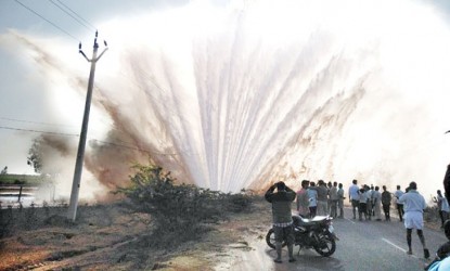 నాగర్ కర్నూల్ జిల్లాలో తాడూరు మండలం మెడిపూర్ గ్రామం వద్ద నాగర్ కర్నూల్ నుంచి కల్వకుర్తి వెళ్ళే రహదారి పక్కనే ఉన్న మిషన్ భగీరధ పైపులైను లీక్ అవడంతో సుమారు 60 ఎడుగుల ఎత్తు నీరు ఎగసిపడింది. దాంతో చాలాసేపూ ఆ రహదారిపై రాకపోకలు నిలిచిపోయాయి. ఈ సంగతి తెలుసుకున్న అధికారులు వెంటనే నీటి సరఫరాను నిలిపివేసి, లీక్ అయిన చోట మరమత్తుపనులు చేస్తున్నారు.