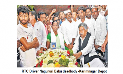 కరీంనగర్ డిపోలో ఆర్టీసీ డ్రైవరుగా పనిచేస్తున్న నగునూరి బాబు (52) మొన్న సరూర్నగర్ సభకు వెళ్లినప్పుడు గుండెపోటుతో మృతి చెందడంతో ప్రభుత్వ వైఖరి కారణంగానే ఆర్టీసీ కార్మికులు చనిపోతున్నారని ఆరోపిస్తూ ఆర్టీసీ కార్మిక సంఘాలు నిన్న కరీంనగర్ బంద్కు పిలుపునిచ్చాయి.