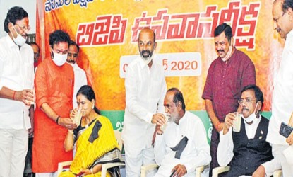 జీహెచ్ఎంసీ ఎన్నికలలో టిఆర్ఎస్ ప్రభుత్వం అధికార దుర్వినియోగాన్ని, ఎన్నికల సంఘం వైఫల్యాలను, పోలీసుల తీరునునిరసిస్తూ బిజెపి జాతీయ ఉపాధ్యక్షురాలు డికె.అరుణ, ఓబీసీ మోర్చా జాతీయ అధ్యక్షుడు కె.లక్ష్మణ్, మాజీ ఎంపీ వివేక్ నిరసన తెలియజేస్తూ రాష్ట్ర ఎన్నికల సంఘం కార్యాలయం ఎదుట నిన్న నిరాహారదీక్ష చేశారు. రాష్ట్ర బిజెపి అధ్యక్షుడు బండి సంజయ్, కేంద్ర హోంశాఖ సహాయ మంత్రి జి.కిషన్రెడ్డి నిన్న సాయంత్రం వారికి నిమ్మరసం ఇచ్చి దీక్షను విరమింపజేశారు.