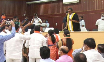 దాంతో టిఆర్ఎస్‌ కార్పొరేటర్లు వారిని అడ్డుకొనే ప్రయత్నించడంతో ఇరువర్గాల మద్య వాదనలు, నినాదాలు, తరువాత తిట్లు, తోపులాటలతో కౌన్సిల్ సమావేశం రసభాసగా మారింది. బిజెపి కార్పొరేటర్ల తీరుపై మేయర్ సునీల్‌ రావు ఆగ్రహం వ్యక్తం చేస్తూ ‘యూజ్ లెస్ ఫెలోస్’ అని అనడంతో వారు అక్కడే బైటాయించి మేయర్ క్షమాపణలు చెప్పాలని కోరుతూ నినాదాలతో సమావేశమందిరాన్ని హోరెత్తించారు. చివరికి పోలీసులు కలుగజేసుకొని ఇరువర్గాలను బయటకు పంపించడంతో కౌన్సిల్ సమావేశం అర్దాంతరంగా ముగిసింది.