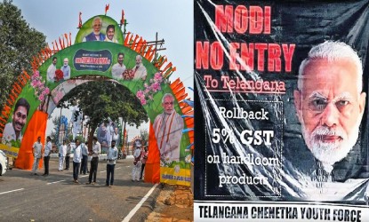 ఏపీలో ఘనంగా స్వాగత సత్కారాలు అందుకొని రేపు మధ్యాహ్నం బేగంపేట విమానాశ్రయానికి చేరుకోనున్న ప్రధాని మోడీకి తెలంగాణలో పర్యటన ముగించుకొని తిరిగి ఢిల్లీ వెళ్ళేవరకు అడుగడుగునా నిరసనలు ఎదురవబోతున్నాయి. ఇప్పటికే వామపక్షాలు, విద్యార్ధి సంఘాలు, చేనేత, సింగరేణి కార్మికులు మోడీకి నిరసనలు తెలిపేందుకు సిద్దం అవుతున్నారు. హైదరాబాద్తో సహా కొన్ని చోట్ల ‘మోడీ గో బ్యాక్’ అంటూ ఫ్లెక్సీ బ్యానర్లు కూడా వెలిశాయి. ఈసారి కూడా సిఎం కేసీఆర్ ప్రధాని నరేంద్రమోడీకి మొహం చాటేయనున్నారు. బహుశః మంత్రి తలసాని యాదవ్ని పంపించవచ్చు. కనుక ప్రధాని నరేంద్రమోడీకి ఈసారి రెండు తెలుగు రాష్ట్రాలలో పూర్తిభిన్నమైన అనుభవాలు ఎదుర్కోబోతున్నారు.