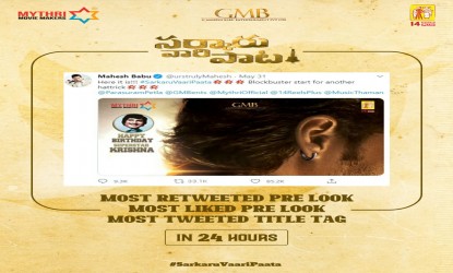ఇలా టైటిల్ పోస్టర్ రిలీజ్ అయ్యిందో లేదో అలా వైరల్ గా మారింది. అంతేకాదు ప్రీ లుక్ పోస్టర్ లో ఫాస్టెస్ట్ మిలియన్ మార్క్ అందుకున్న రికార్డ్ సర్కారు వారి పాట అందుకుంది. అంతేకాదు 24 హావర్స్ లో కూడా ఏ ప్రీ లుక్ పోస్టర్ కు రాణి వ్యూస్, రీ ట్వీట్స్ తో మహేష్ మరోసారి దుమ్ముదులిపేశాడు. భరత్ అనే నేను, మహర్షి, సరిలేరు నీకెవ్వరు సినిమాలతో వరుస హిట్లు అందుకున్న మహేష్ సర్కారు వారి పాట సినిమాతో మరో సంచలనం సృష్టించనున్నాడని తెలుస్తుంది. మరి ఈ సినిమా ఎలా ఉండబోతుందో చూడాలి. ప్రీ లుక్ లో మహేష్ గెడ్డం లుక్, చెవికి పోగు, మెడ మీద రూపాయి ట్యాటూ చూస్తుంటే పోకిరి తర్వాత మహేష్ మాస్ అవతార్ గా కనిపించే ఈ సినిమా సూపర్ స్టార్ ఫ్యాన్స్ కు పండుగ తెచ్చేలా ఉంది.