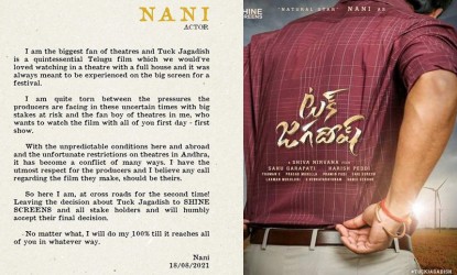 అయితే ప్రస్తుతం థియేటర్లు తెరచుకున్నా ఆంధ్రాలో ఇంకా నైట్ కర్ఫ్యూ కొనసాగుతుంది.. అక్కడ 50 పర్సెంట్ ఆక్యుపెన్సీ.. రోజుకి 3 షోలు మాత్రమే వేస్తున్నారు. ఈ టైం లో టక్ జగదీష్ రిలీజ్ కష్టమని భావించిన నిర్మాతలు ఓటీటీకే మొగ్గు చూపుతున్నారు. ఇక నాని కూడా ఈ విషయంపై ఓ ఓపెన్ లెటర్ షేర్ చేసుకున్నాడు. టక్ జగదీష్ సినిమా పై తన మనసులో మాట బయట పెట్టాడు నాని. తాను మరోసారి క్రాస్ రోడ్స్ లో నిలబడినట్టు అయ్యిందని.. ఆవేదన వ్యక్తం చేశారు నాని. సినిమా అభిమానిగా అభిమానులతో, ప్రేక్షకులందరితో కలిసి ఫస్ట్ డే ఫస్ట్ షో చూడటమే తనకు ఇష్టమని.. టక్ జగదీష్ సినిమాను కూడా థియేట్రికల్ ఎక్స్ పీరియన్స్ కోసమే చేశామని.. కరోనా పాండమిక్ పరిస్థితుల కారణంగా ప్రపంచవ్యాప్తంగా పరిస్థితులు ఎలా ఉన్నాయో తెలిసిందే.. ఆంధ్రాలో ఇంకా కొన్ని థియేటర్లు పూర్తిగా తెరచుకోలేదు. నిర్మాతలకు ఉన్న ఇబ్బందులను దృష్టిలో ఉంచుకుని టక్ జగదీష్ రిలీజ్ నిర్ణయం వారికే వదిలేశానని క్లారిటీ ఇచ్చారు నాని. నిర్మాతలు మనసు మార్చుకుని థియేట్రికల్ రిఈజ్ చేస్తే ముందు ఆనందించే వ్యక్తిని నేనే అంటూ నాని లెటర్ లో తెలిపాడు. మొత్తానికి నాని టక్ జగదీష్ రిలీజ్ విషయంలో బాగా నలిగిపోతున్నాడని అర్ధమవుతుంది.