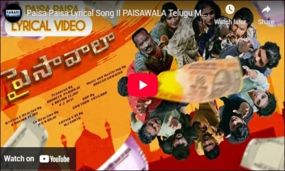 నవీన్ తేజస్ దర్శకత్వంలో రాజేష్ బెజ్జంకి తదితరులు నటించిన చిత్రం పైసవాలా. ఈ సినిమా నుంచి పైసా పైసా అంటూ సాగే లిరికల్ వీడియో సాంగ్‌ విడుదల చేశారు. ఈవీఆర్, జగదీష్ కలిసి చిన్న చిన్న పదాలతో ‘పైసా’ గురించి చాలా అద్భుతంగా వ్రాసిన ఈ పాటకు సంగీతం నాగేష్ గౌరీష్ చేయగా చరణ్ ఆలపించారు.