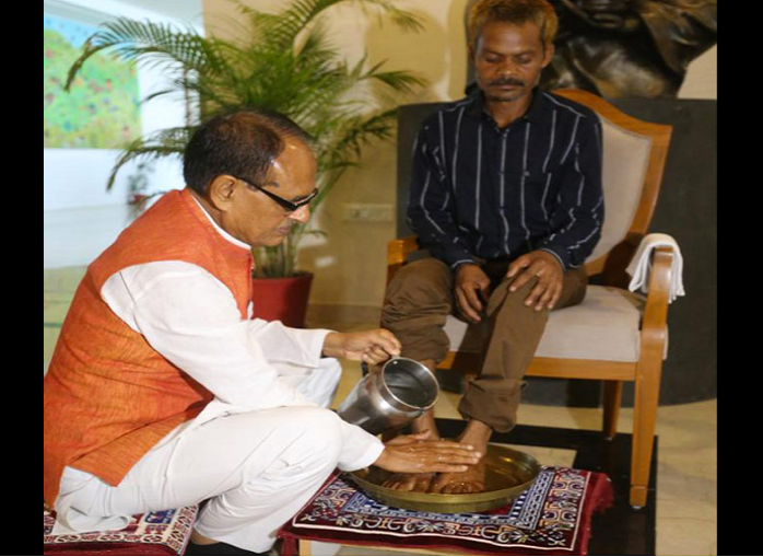 ఆదివాసి కాళ్ళు కడిగి క్షమాపణలు చెప్పిన ముఖ్యమంత్రి